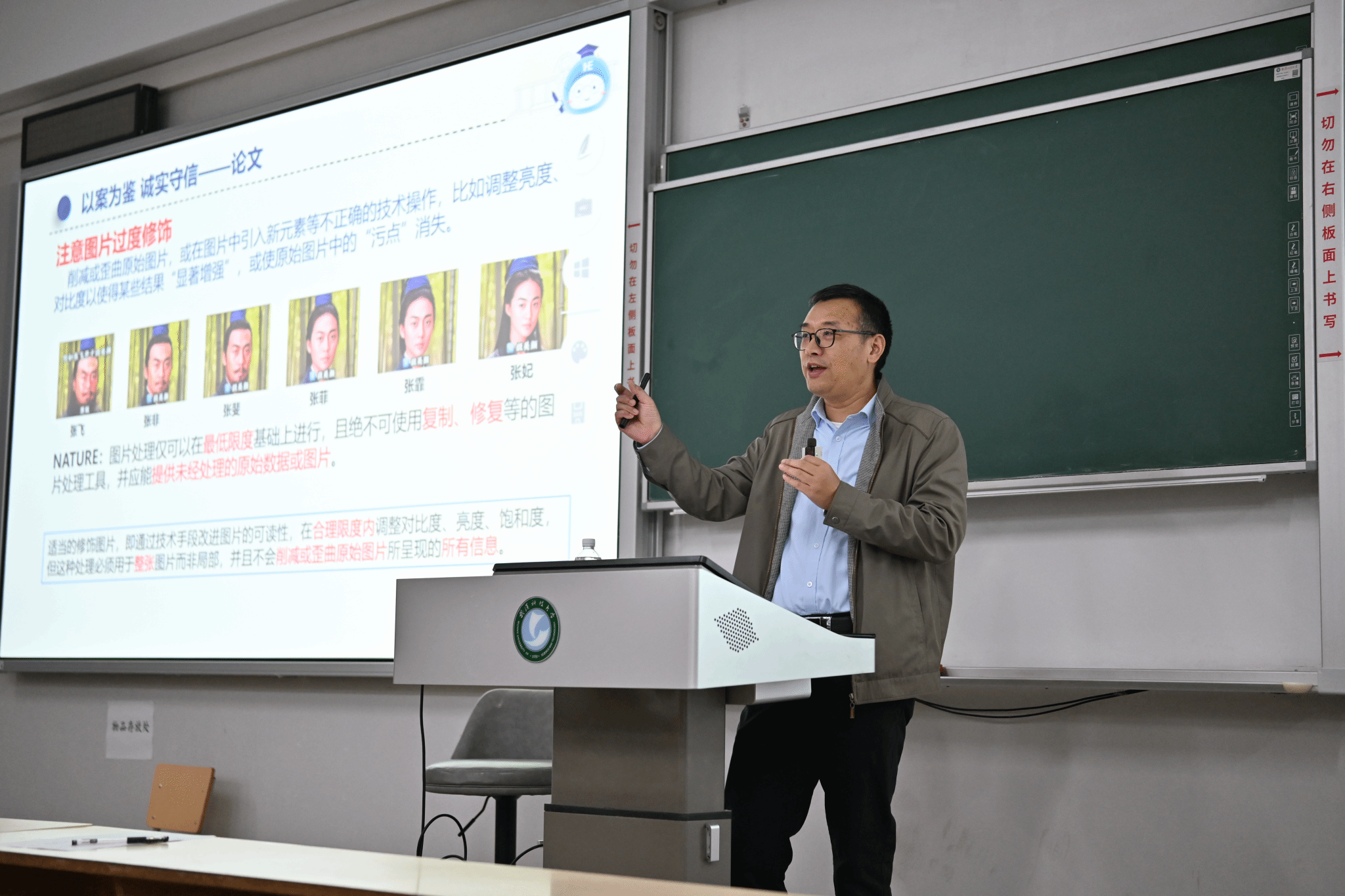 报告会上,邱进俊主任以“恪守学术道德,遵守学术规范”为主题,深入剖析了当前科研诚信面临的挑战。他通过论文工厂、数据篡改、项目重复申报等典型案例,揭示了学术不端行为的严重危害,并强调在科研诚信问题“凸显期”的当下,筑牢思想防线尤为重要。“科研诚信是科技工作者的生命线,”邱进俊指出,“一旦触碰红线,将对学术发展造成不可逆的影响。”