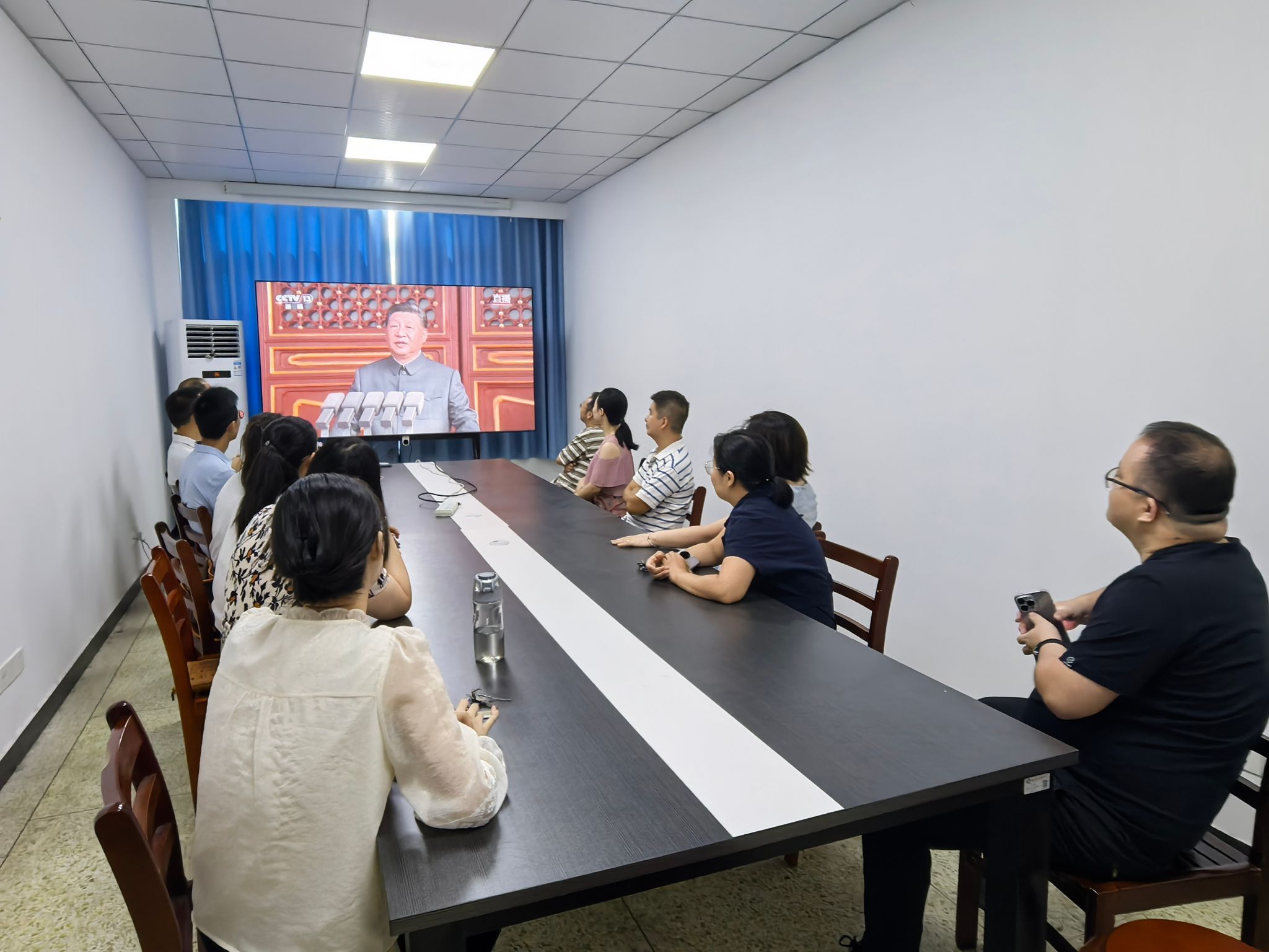 上午9时,学院领导班子和管理干部在教六楼6302-1会议室集中观看纪念大会直播盛况,全院师生采取集中与分散相结合的方式观看。阅兵仪式开始后,习近平总书记乘红旗检阅车沿着宽阔的长安街,依次检阅徒步方队、战旗方队、装备方队。受阅部队军容严整、意气风发,铁甲战车整齐列阵、威风凛凛,让现场观看的教师党员不时爆发出热烈掌声。